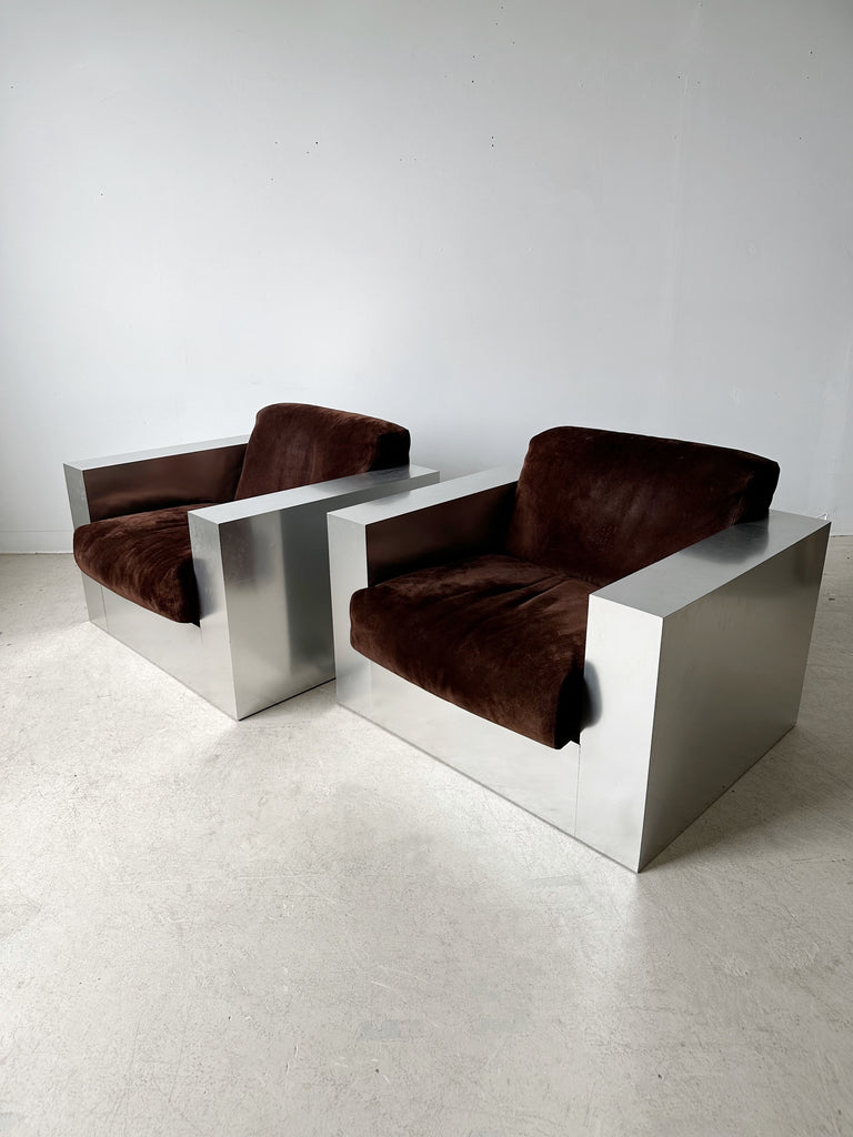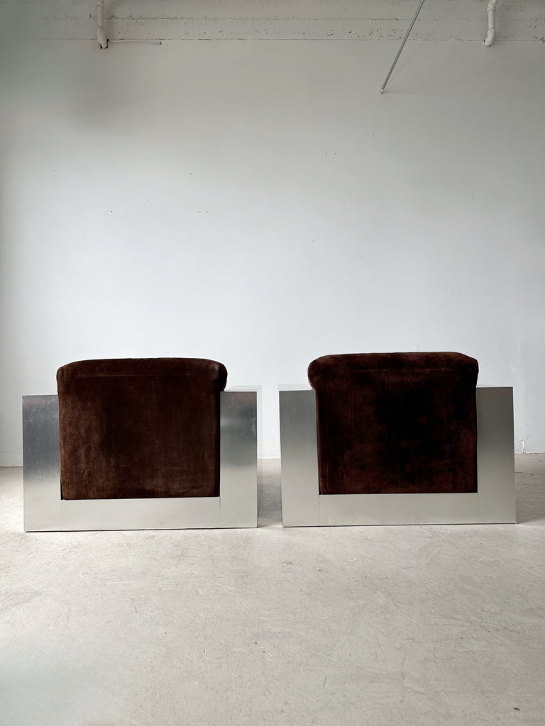 STEEL LAMINATE & BROWN SUEDE ARMCHAIRS BY THAYER COGGIN, 70's